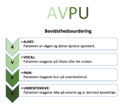 AVPU bruges, når man undersøger bevidstheden af patienten i sin primære vurdering. Dernæst undersøger du patientens luftveje, vejrtrækning og kredsløb, dette kan du læse mere om under ambulancefaget ABCDE-princippet.